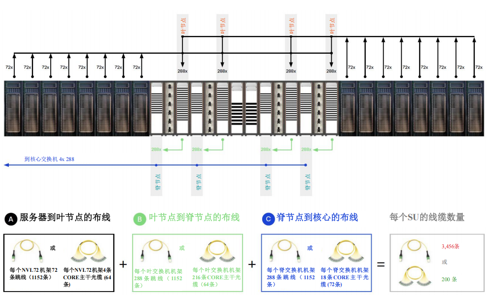 每個(gè)含16個(gè)NVL72機(jī)架的可擴(kuò)展單元(SU)共需要1152條到葉交換機(jī)的MPO-8/12 APC 8芯連接(每臺(tái)服務(wù)器4條 – 每個(gè)機(jī)架72條)