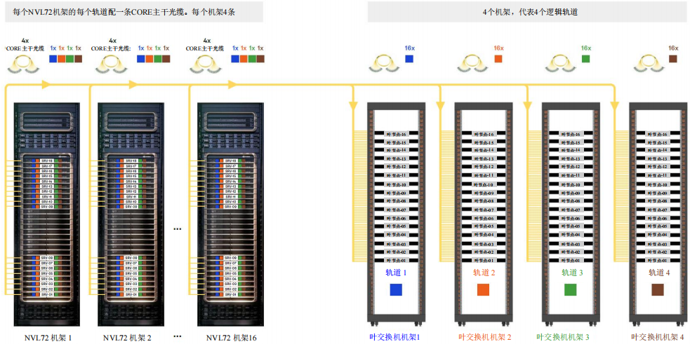 在圖13的左側(cè),我們可以看到一個(gè)包含18臺(tái)服務(wù)器的NVL72機(jī)架,NVL72機(jī)架內(nèi)的每個(gè)托盤對(duì)應(yīng)其各自的軌道。在右側(cè),是軌道1的葉交換機(jī)機(jī)架,內(nèi)含16臺(tái)葉交換機(jī),與可擴(kuò)展單元內(nèi)各個(gè)NVL72機(jī)架一一對(duì)應(yīng)。眾所周知,Quantum-2交換機(jī)支持32個(gè)雙MPO-8/12 APC端口,這意味著每臺(tái)交換機(jī)可以支持多達(dá)64個(gè)獨(dú)立連接。