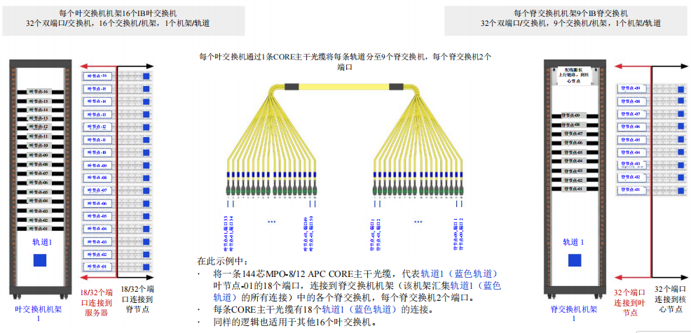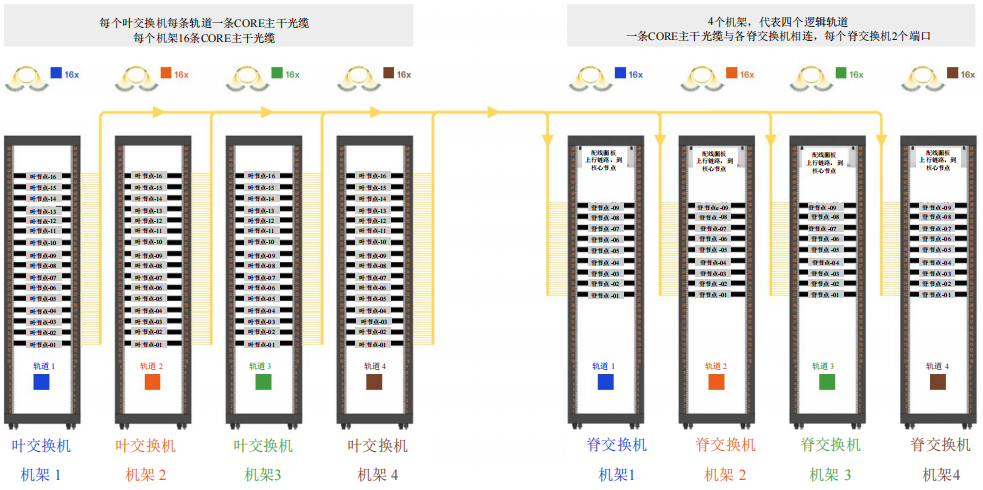 每條CORE主干光纜的設(shè)計(jì)都適于處理軌道1(藍(lán)色軌道)的18個(gè)連接,簡(jiǎn)化布線的同時(shí)降低復(fù)雜性。同樣的原理也適用于軌道1(藍(lán)色軌道)內(nèi)其他16個(gè)葉交換機(jī),每個(gè)葉交換機(jī)都采用相同的CORE主干光纜配置來(lái)建立與脊交換機(jī)機(jī)架的連接。