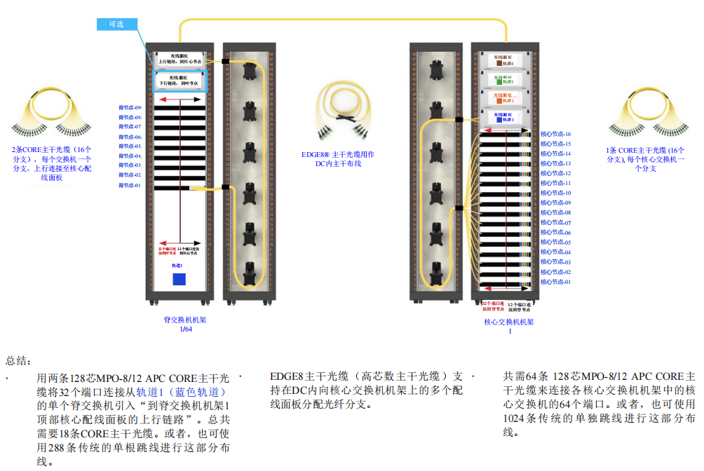 ● 節(jié)點(diǎn)到葉節(jié)點(diǎn)(A級(jí))的1152個(gè)MPO連接:這些連接可以使用點(diǎn)對(duì)點(diǎn)布線來(lái)實(shí)現(xiàn),布線布局含64條CORE主干光纜(每條144芯)或1152條單根8芯跳線。