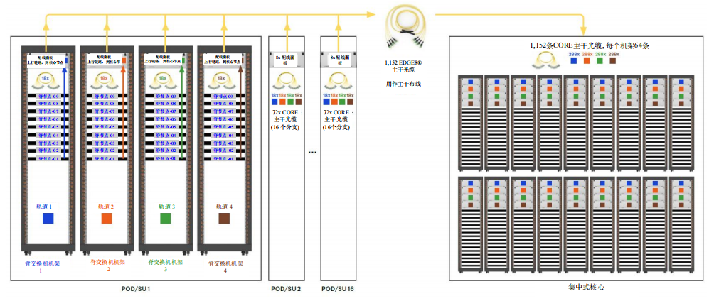 無(wú)論選擇哪種方法,我們都將在SU內(nèi)建立1152個(gè)到葉交換機(jī)的MPO-8/12 APC連接和1152個(gè)到脊交換機(jī)的連接,并再建立1152個(gè)到核心交換機(jī)的連接,將SU連接到核心交換機(jī)。