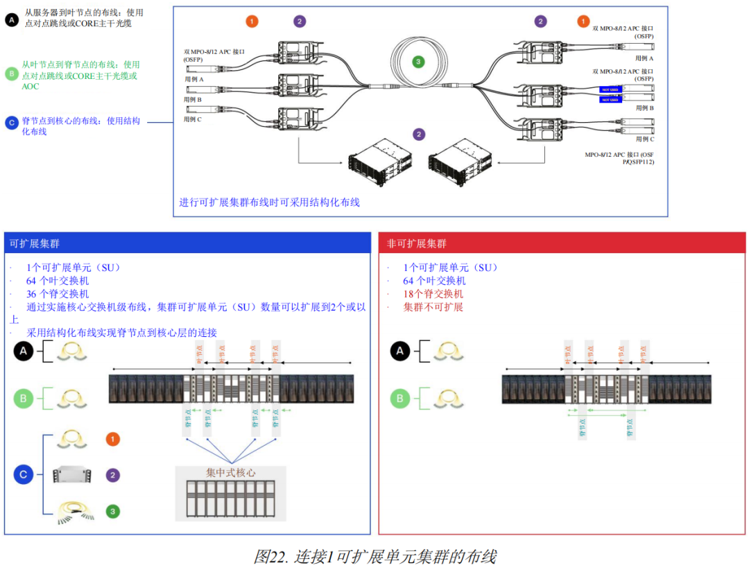 一個(gè)可擴(kuò)展單元可以通過(guò)節(jié)點(diǎn)(服務(wù)器)和葉交換機(jī)之間的點(diǎn)對(duì)點(diǎn)連接來(lái)布線(見(jiàn)圖1),其中至少有兩種布線產(chǎn)品選項(xiàng)可供選擇(見(jiàn)圖12)。在一些特定的定制設(shè)計(jì)中,也可以在可擴(kuò)展單元級(jí)別實(shí)施結(jié)構(gòu)化布線(見(jiàn)圖2)。