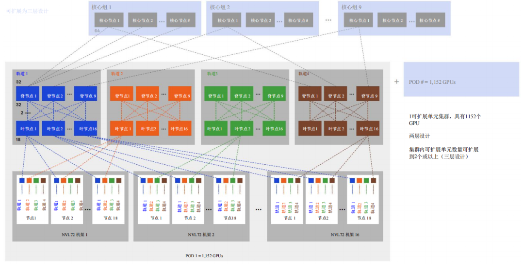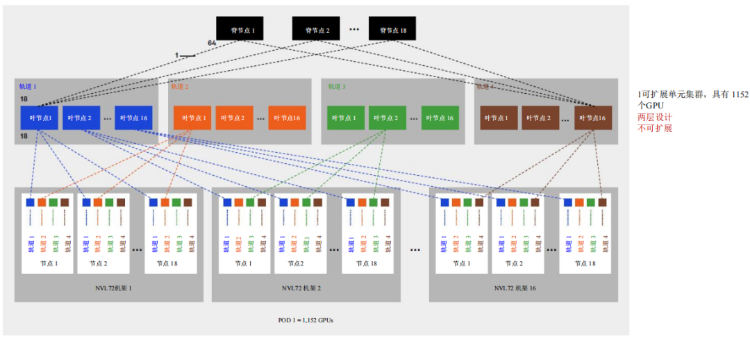 1152GPU集群,采用兩層設(shè)計(jì),有36個(gè)脊交換機(jī)
