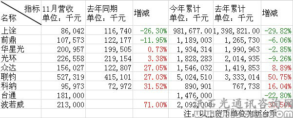 ICCSZ訊(編輯:Debi)2013年已經(jīng)過去,近日,臺灣光通訊廠商紛紛公布2013年12月營收以及2013年全年營收情況,訊石小編進行了綜合整理,并進行簡要分析變動原因。2013年12月,臺灣光通訊廠商普遍實現(xiàn)營收增長,僅上詮12月營收9468.7萬,同比下降4.69%,其他廠商12月營收均實現(xiàn)增長,幅度大小不一。