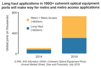 ICCSZ訊(編譯:Nina)據(jù)IHS調(diào)查,2014年城域區(qū)域光網(wǎng)絡(luò)相干100G端口出貨量年增145%,并且今年預(yù)計(jì)還將年增118%。