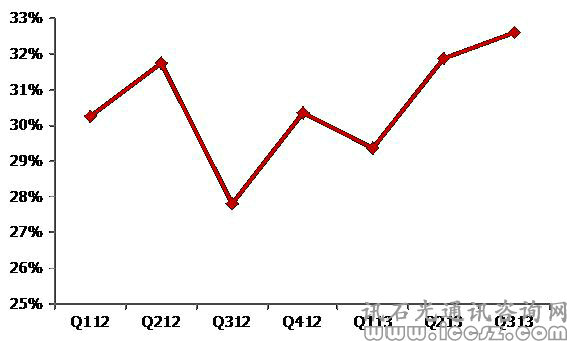 自實(shí)施轉(zhuǎn)型戰(zhàn)略以來(lái),阿朗經(jīng)營(yíng)狀況得到了有效改善,2013年三季度營(yíng)收為36.68億歐元,同比環(huán)比均得到增長(zhǎng),且季度毛利率得到持續(xù)提升,三季度達(dá)到32.6%,并且在2013年三季度阿朗在IP邊緣、IP路由以及光網(wǎng)絡(luò)領(lǐng)域位列全球市場(chǎng)排名前兩位,分別占據(jù)29%、20%、14%的市場(chǎng)份額。