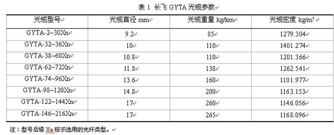 由此公式可以發(fā)現(xiàn),當光纜密度大于水的密度時,水的浮力可降低光纜等效重力Fn,從而減小光纜與管道之間的摩擦阻力Ff。同時水可起潤滑作用,降低管壁摩擦系數(shù)μ,從而產(chǎn)生高于人工牽引和氣吹法的單次敷設(shè)距離。當單位長度內(nèi)光纜重量與水的重量相當時,光纜可在水中處于懸浮狀態(tài)而與管道內(nèi)壁幾乎無摩擦阻力,單次敷設(shè)距離可達最大。而當光纜密度小于水的密度時,其浮力可能使光纜與管道上壁摩擦,反而會使光纜所受阻力增加。以長飛GYTA規(guī)格參數(shù)為例(表1),光纜密度均略大于水的密度。