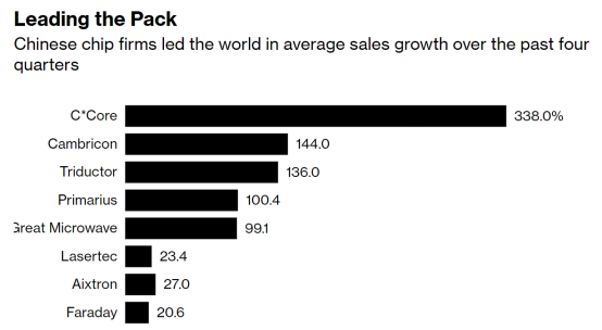 根據(jù)彭博匯編的數(shù)據(jù),在過去四個(gè)季度中,全球 20 家增長(zhǎng)最快的芯片行業(yè)公司中,有 19 家來中國大陸。相比之下,去年同期只有 8 個(gè)。如果從增長(zhǎng)速度的角度看,這些對(duì)芯片制造至關(guān)重要的設(shè)計(jì)軟件、處理器和設(shè)備的中國供應(yīng)商數(shù)倍于臺(tái)積電或 ASML 等大型半導(dǎo)體公司。