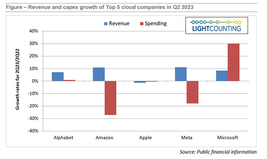 互聯(lián)網(wǎng)內(nèi)容提供商(ICP)和通信服務(wù)提供商(CSP)方面,關(guān)鍵業(yè)務(wù)與前兩個季度的情況一樣,增長放緩;裁員也在繼續(xù),且大多數(shù)企業(yè)預(yù)計2023年的支出增長將放緩。特別令人不安的是,排名前四的大型數(shù)據(jù)中心運營商的云服務(wù)銷售增長放緩的長期趨勢在2023年第二季度持續(xù),盡管目前似乎被“人工智能軍備競賽”所掩蓋。如下所示,微軟的收入和支出都創(chuàng)下了歷史新高,超過了其他公司。