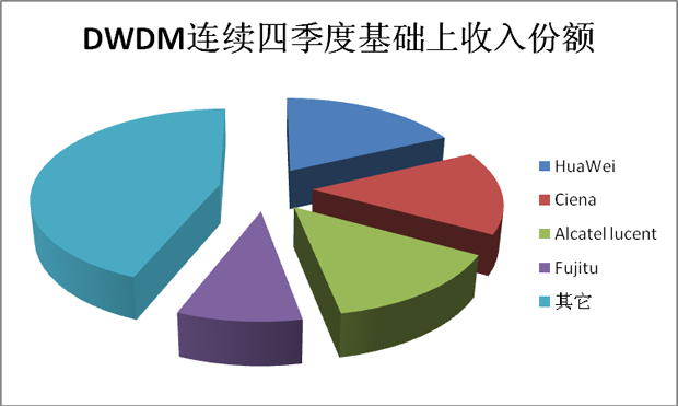 該研究還指出DWDM市場在各地區(qū)均有所增長,同比增長率最高的地區(qū)是EMEA和拉美地區(qū),二者的增長率均超過50%。設(shè)備供應(yīng)商在過去四個季度(Q310-Q211)基礎(chǔ)上的收入份額如下: