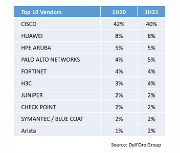 分析表明,前十名供應(yīng)商的排名和份額保持相對(duì)穩(wěn)定,前兩名供應(yīng)商思科和華為占全球企業(yè)網(wǎng)絡(luò)設(shè)備市場(chǎng)的近50%份額。然而,相比2020年上半年,思科失去了一些份額,同時(shí)Palo Alto Networks、H3C和Arista的市場(chǎng)份額分別上升了1個(gè)百分點(diǎn)。