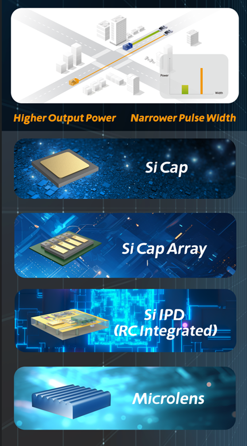 硅電容在激光雷達(dá)中的應(yīng)用主要體現(xiàn)在脈沖生成電容方面。硅電容相比傳統(tǒng)陶瓷電容,可以更靠近激光器打線,有助于降低回路整體ESL,改善脈沖波形,從而實(shí)現(xiàn)更遠(yuǎn)的探測(cè)距離。硅電容的容值穩(wěn)定性高(隨著電壓和溫度變化容值幾乎不變),可以更穩(wěn)定地輸出激光器能量。此外,硅電容還能提供cap array(排容)和集成了無源被動(dòng)器件的硅IPD產(chǎn)品,為客戶提供高性能、高可靠性的全套解決方案。蘇納光電的硅電容產(chǎn)品具備可定制、響應(yīng)快、交付快等優(yōu)點(diǎn),并且已經(jīng)在汽車、消費(fèi)、光通信等領(lǐng)域得到廣泛應(yīng)用。