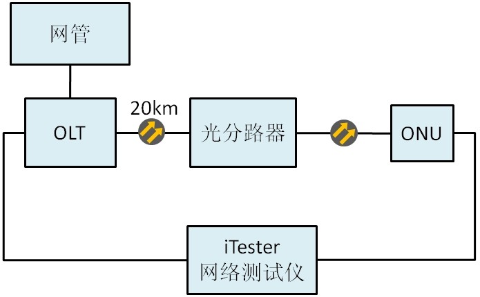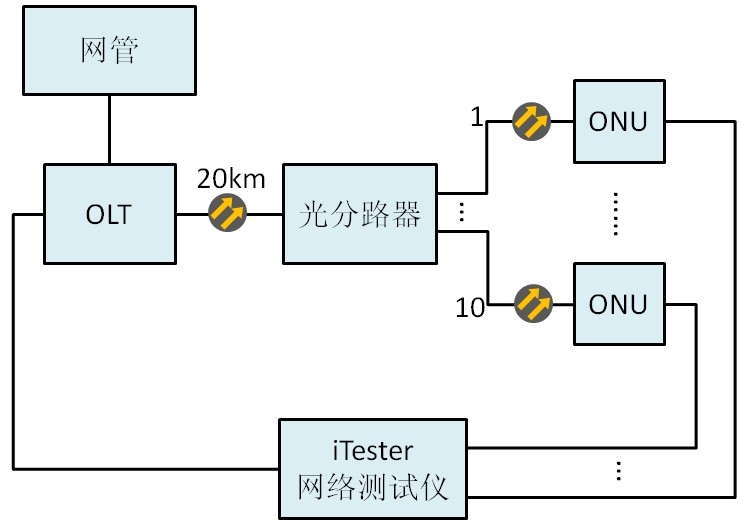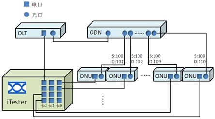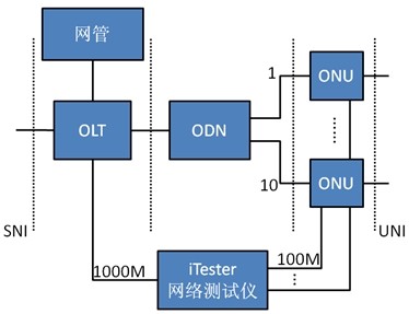 使用iTester網(wǎng)絡(luò)測試儀進(jìn)行XPON系統(tǒng)測試時,需將OLT接入網(wǎng)絡(luò)測試儀的一個端口,將剩余ONU設(shè)備分別接入網(wǎng)絡(luò)測試儀的其余端口。
