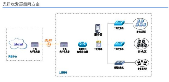 產(chǎn)品一般應(yīng)用在以太網(wǎng)電纜無(wú)法覆蓋、必須使用光纖來(lái)延長(zhǎng)傳輸距離的實(shí)際網(wǎng)絡(luò)環(huán)境中,且通常定位于寬帶城域網(wǎng)的接入層應(yīng)用;同時(shí)在幫助把光纖最后一公里線路連接到城域網(wǎng)和更外層的網(wǎng)絡(luò)上也發(fā)揮了巨大的作用。下圖為光纖收發(fā)器組網(wǎng)方案:
