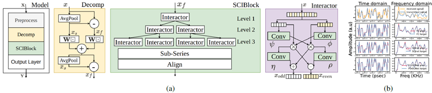 圖1. (a) 展示了創(chuàng)新的FC-SCINet均衡器的框圖。(b) 顯示了50個(gè)傳輸(目標(biāo))/接收連續(xù)樣本的時(shí)間/頻率域表示,分別顯示了FC和SCInet的影響。
