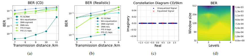 圖2. (a),(b) 展示了FC-SCInet、DNN、FFE和無(wú)均衡的情況下的誤碼率與距離的關(guān)系,分別針對(duì)Case 1-2(CD-Realistic)。(c) 展示了Case 1(CD)在9 km處的接收星座圖。(d) 展示了Case 1(CD)在9 km處的FC-SCInet窗口大小和互動(dòng)器級(jí)別的誤碼率顏色圖。