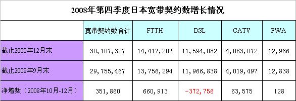 2009年3月18日,根據(jù)日本總務(wù)省最新公布的數(shù)據(jù)顯示,截止2008年12月末,日本寬帶契約數(shù)達(dá)到3011萬(wàn),首次超過3000萬(wàn);其中FTTH契約數(shù)達(dá)到1442萬(wàn),連續(xù)三個(gè)季度超過了DSL契約數(shù)。