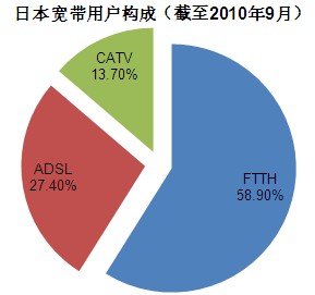 另一方面,ADSL則下降至895.5萬線,半年間減少了74.5萬線。從市場份額來看, ADSL占據(jù)整個寬帶契約數(shù)的27.4%,首次下降到30%以下,F(xiàn)TTH為58.9%,CATV占13.7%。