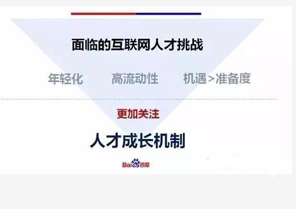 而站在互聯(lián)網(wǎng)尤其像百度,我感覺人才矛盾點更多集中在高大上那邊的事情,也就實說我們其實更多會去看人才成長機制。進入互聯(lián)網(wǎng)時代人才競爭非常激烈,在兩三年前我們創(chuàng)始人CEO跟我們說,他說資本的話語權(quán)在讓位于知本,從capitalism 轉(zhuǎn)向 talentism。這個詞我們的感受還是很深刻的,如果一些比較厲害的人能夠為你所用,其實給公司和社會帶來的價值是非常大的,這是剛才說比較高大上的部分。