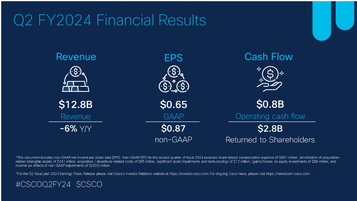 ICC訊(編譯:Vicki)思科公布了截止到2024年1月27日的2024財(cái)年第二季度的財(cái)務(wù)業(yè)績(jī)。