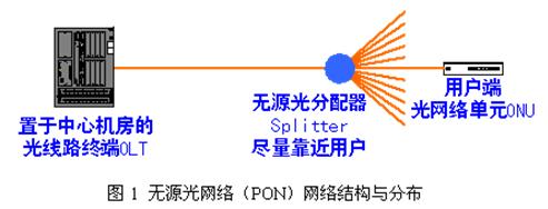 如圖1是理想無源光網(wǎng)絡(luò)(Passive Optical Network——PON)網(wǎng)絡(luò)結(jié)構(gòu)與分布,其主要特點(diǎn)是:光線路終端(Optical Line Terminal——OLT)置于電信運(yùn)營商中心機(jī)房,無源光分配器放置(Splitter)盡量靠近用戶端的光網(wǎng)絡(luò)單元(Optical Network Unit——ONU)。OLT與ONU之間的距離等于電信運(yùn)營商中心機(jī)房到用戶的距離,與目前固定電話的接入距離相仿,一般為幾公里,Splitter距ONU一般為幾十米到幾百米。PON的這種結(jié)構(gòu)和布局突出體現(xiàn)了PON的優(yōu)勢:從中心機(jī)房至用戶的整個網(wǎng)絡(luò)為無源網(wǎng)絡(luò);大量節(jié)約中心機(jī)房至用戶的光纜資源;因?yàn)槭且稽c(diǎn)對多點(diǎn),精簡中心機(jī)房設(shè)備數(shù)量與規(guī)模,減少中心機(jī)房配線數(shù)量。