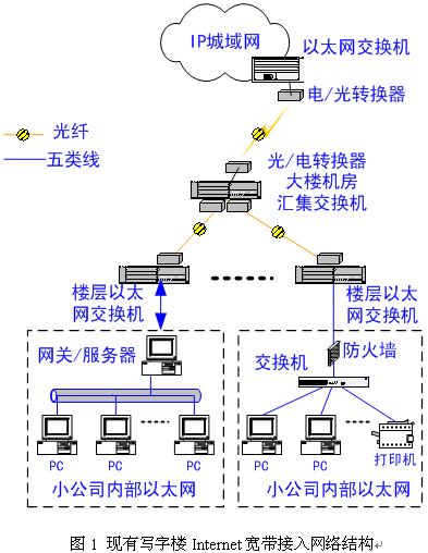 在圖1典型寫字樓Internet寬帶接入網(wǎng)絡(luò)結(jié)構(gòu)中,由于受銅質(zhì)5類線傳輸距離小于100米的限制,存在大量的接入交換機(jī)和光電轉(zhuǎn)換器,它們被放置在多塵灰、散熱條件差的樓層配線間的掛壁式機(jī)柜內(nèi),致使交換機(jī)和光電轉(zhuǎn)換器極易出現(xiàn)故障甚至損壞,如死機(jī)、過熱、塵埃大量堆積、接插口污染或氧化等故障;其次,由于有源節(jié)點(diǎn)過多,網(wǎng)絡(luò)維護(hù)管理成本非常高;再次,因樓層接入交換機(jī)一般網(wǎng)管功能相對(duì)簡(jiǎn)單,網(wǎng)絡(luò)的安全性、可管理性較差,對(duì)用戶的權(quán)限管理非常吃力。