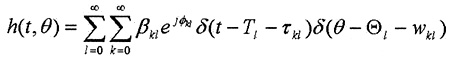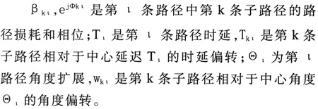 基于幾何統(tǒng)計(jì)法是對(duì)確定性模型中的射線追蹤法的一種簡(jiǎn)化,它不需要詳細(xì)知道信道環(huán)境和對(duì)特定的環(huán)境生成電子地圖,它根據(jù)一定的統(tǒng)計(jì)特性在基站和移動(dòng)臺(tái)周圍隨機(jī)散布散射體組,對(duì)于每一個(gè)散射體組中散射體要符合測(cè)量統(tǒng)計(jì)出來(lái)特定角度延遲功率譜(ADPS),每個(gè)散射體組對(duì)應(yīng)信道模型中的一條路徑,而組中散射體反射、散射和繞射到接收端的射線就組成路徑中的各條子路徑。用射線跟蹤法來(lái)確定每條射線的角度、時(shí)延等信道參數(shù);在接收端將這些射線迭加起來(lái)就得到了信道沖激響應(yīng)。迭加公式如下: