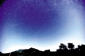 晚上10時(shí) 30分左右,150人的“大部隊(duì)”打著手電筒,走上山頭,大家支起帳篷,鋪上防潮墊,為觀測(cè)流星雨做準(zhǔn)備。不一會(huì),大家都平躺在草地上,仰望天空。此時(shí),工作人員打開指星筆,“瞧,這是天琴座,這是仙后座,那是英仙座……”隨著指星筆發(fā)出的光束,大家一一辨識(shí)著夏夜星空中的星座。不時(shí)有一顆流星“倏”地飛過,人群中就會(huì)爆發(fā)出一陣驚喜的歡呼聲。