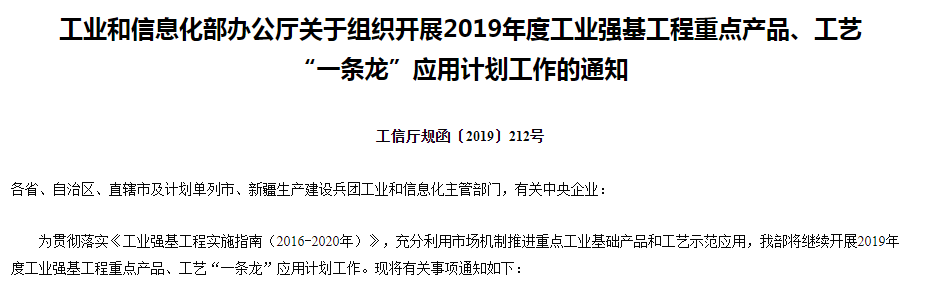 ICCSZ訊 近日,工信部發(fā)布關(guān)于組織開展2019年度工業(yè)強基工程重點產(chǎn)品、工藝“一條龍”應(yīng)用計劃工作的通知,圍繞《工業(yè)強基工程實施指南(2016-2020年)》“一條龍”應(yīng)用計劃,以上下游需求和供給能力為依據(jù),以應(yīng)用為導(dǎo)向,依托第三方機構(gòu),針對重點基礎(chǔ)產(chǎn)品、工藝,梳理產(chǎn)業(yè)鏈重要環(huán)節(jié),遴選各環(huán)節(jié)承擔(dān)單位,加快工業(yè)強基成果推廣應(yīng)用。