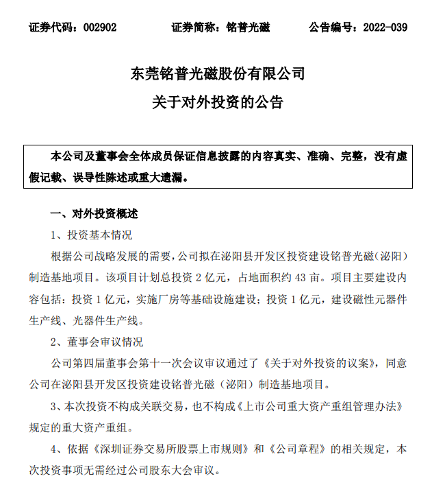 ICC訊 東莞銘普光磁股份有限公司(以下簡(jiǎn)稱“銘普光電”或“公司”)發(fā)布關(guān)于對(duì)外投資的公告稱:根據(jù)公司戰(zhàn)略發(fā)展的需要,公司擬在泌陽(yáng)縣開(kāi)發(fā)區(qū)投資建設(shè)銘普光磁(泌陽(yáng))制造基地項(xiàng)目。該項(xiàng)目計(jì)劃總投資 2 億元,占地面積約 43 畝。項(xiàng)目主要建設(shè)內(nèi)容包括:投資 1 億元,實(shí)施廠房等基礎(chǔ)設(shè)施建設(shè);投資 1 億元,建設(shè)磁性元器件生產(chǎn)線、光器件生產(chǎn)線。
