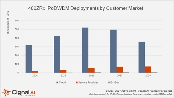 2. 一旦800G和1600G的采用開始,云運(yùn)營商的400G購買量將在2026年達(dá)到峰值。嵌入式和可插拔光學(xué)之間的性能差距將在1600G進(jìn)一步縮小,使IP-over-DWDM從網(wǎng)絡(luò)設(shè)計的角度來看更具吸引力。