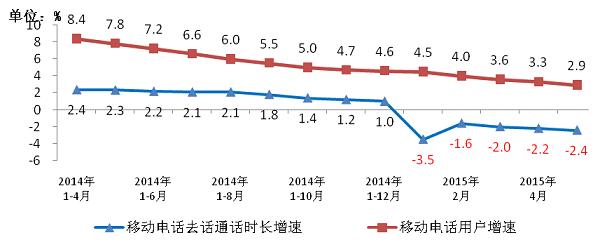 圖5. 2014-2015年4月移動(dòng)電話去話通話量和移動(dòng)電話用戶同比增長(zhǎng)比較