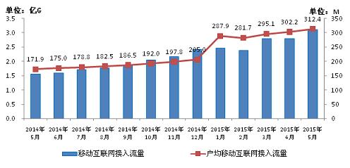 圖7 2014-2015年5月移動(dòng)互聯(lián)網(wǎng)接入流量和戶均流量比較