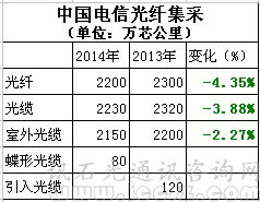 ICCSZ訊(編輯:Debi)1月9日,中國(guó)電信官方公布2014年光纖光纜產(chǎn)品集采結(jié)果,本次集采包括兩類光纖(G.652D光纖與G.657A2光纖)、室外光纜和蝶形引入光纜。此前2014年9月,中國(guó)電信曾公布集采數(shù)據(jù),本次集采光纖總量約2200萬芯公里,同比2013年下滑4.35%;室外光纜集采2150萬芯公里,蝶形光纜集采約80萬芯公里;光纜集采數(shù)同比2013年下滑3.88%。具體對(duì)比如下表:
