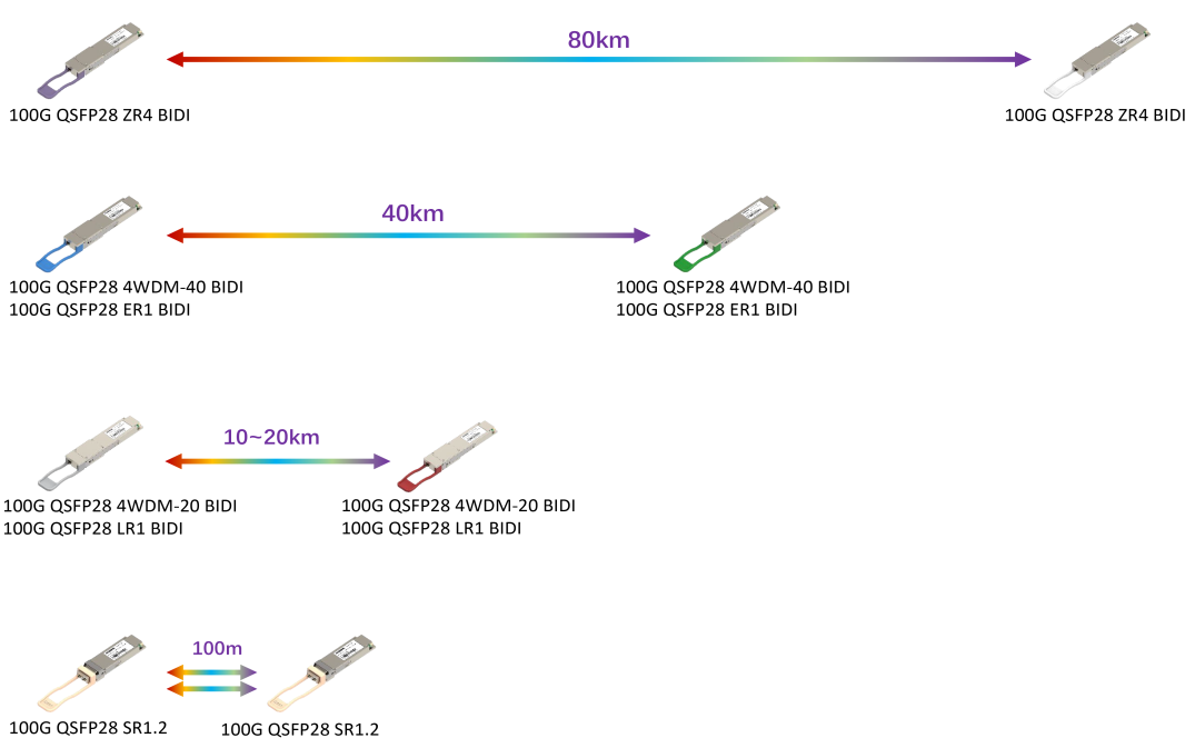 100G QSFP28 BIDI長距系列模塊,適用于長距離、低時延傳輸、光纖資源稀缺的應(yīng)用場景,可滿足城市之間或偏遠(yuǎn)鄉(xiāng)村的互聯(lián)、區(qū)域數(shù)據(jù)中心與邊緣數(shù)據(jù)中心的連接、企業(yè)內(nèi)不同園區(qū)機房之間的互聯(lián),5G匯聚機房至核心路由的互聯(lián)等需求。