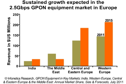 l Infonetics公司預計2.5G GPON設備收入從2010年到2015年GAGR增長率在西歐為16%,中東歐為13%。