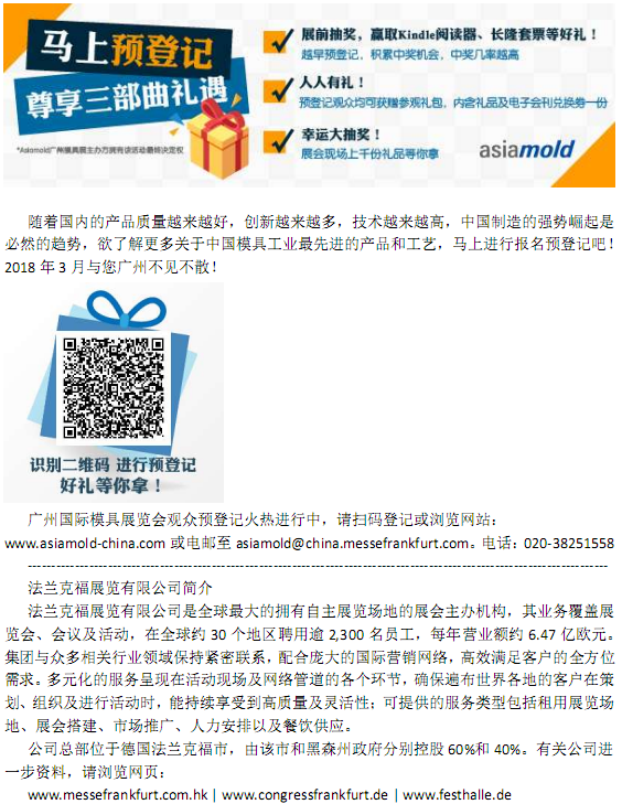 Asiamold2018 第十二屆廣州國(guó)際模具展于2018年3月4日繼續(xù)在廣交會(huì)館隆重召開,也將繼續(xù)承擔(dān)起模具行業(yè)產(chǎn)品技術(shù)更新?lián)Q代先行發(fā)布的窗口,助力中國(guó)制造產(chǎn)業(yè)強(qiáng)勢(shì)崛起,打造模具工業(yè)一站式采購(gòu)平臺(tái),為中國(guó)模具工業(yè)企業(yè)乃至中國(guó)制造“走出去”實(shí)現(xiàn)“一路一帶”而服務(wù)!