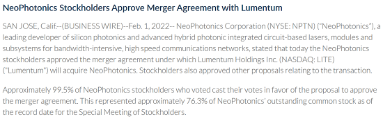 大約99.5%的NeoPhotonics股東投票支持批準合并協(xié)議的提案。這大約占NeoPhotonics在股東特別會議當日發(fā)行在外普通股的76.3%。