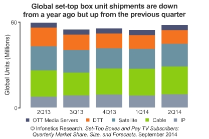 ICCSZ訊 日前,市場調(diào)研公司Infonetics發(fā)布其最新的關(guān)于機(jī)頂盒和付費(fèi)電視的市場報(bào)告,該報(bào)告主要涉及IP、有線、衛(wèi)星電視、數(shù)字地面(DTT)機(jī)頂盒(STB),以及OTT市場。