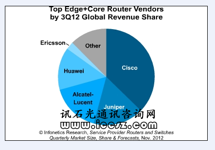 在路由器細分市場(IP邊緣和核心路由器),思科以絕對份額保持遙遙領先;但接下來三位的排名則有大改變,Juniper從華為手中奪回第二的位置,而華為則下滑至第四位,阿爾卡特朗訊保持第三的位置。3Q12,思科、Juniper、阿爾卡特朗訊和華為這四家的銷售收入占整體IP路由器(邊緣和核心)銷售收入的88%。