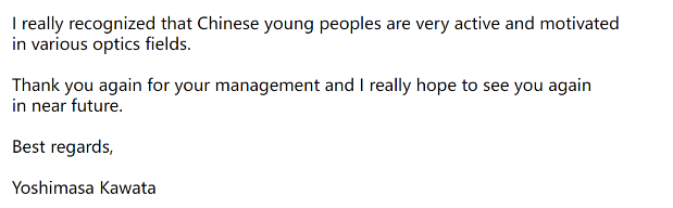 光谷之行后,川田善正特地發(fā)來郵件:“我真切地感受到,在光電領域,中國的年輕人朝氣蓬勃,充滿希望?!?