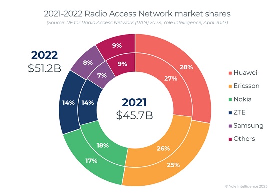 前5大RAN廠商(華為、愛立信、諾基亞、中興和三星)正在鞏固其領先地位。華為和中興由于在中國的大規(guī)模部署而增加了市場份額,三星則利用了其率先采用v-RAN和O-RAN戰(zhàn)略的機會。
