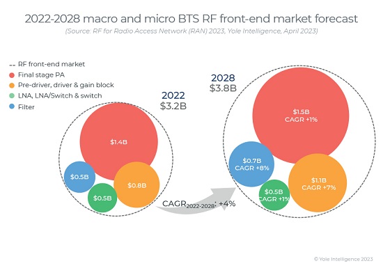 Yole預測,應用于宏基站的射頻組件市場在2022年達到32億美元,預計到2028年將增長到38億美元。2023年,銷量和收入都將大幅增長,這主要是受印度5G網絡部署的推動。在Massive MIMO天線滲透率上升的驅動下,市場需求量也將繼續(xù)增長。