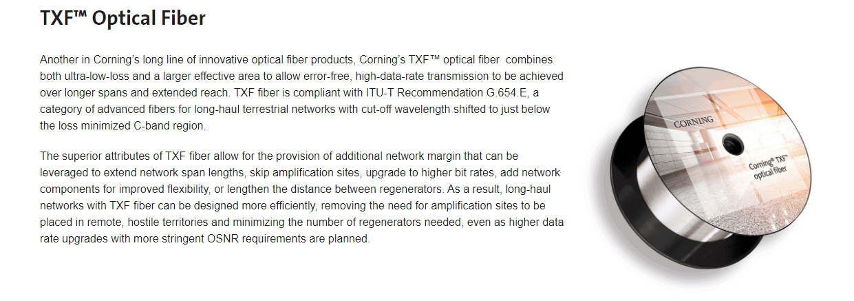 Iccsz訊(編譯:Aiur) 在上周舉辦的OFC2018,領(lǐng)先的各家光纖通信企業(yè)紛紛拿出自己最新研發(fā)和創(chuàng)新產(chǎn)品,跟來自全球各地的光纖通信專業(yè)一同分享交流。作為全球光纖技術(shù)領(lǐng)導(dǎo)者,康寧公司Corning在OFC上展出其享有專利的TXF?光纖產(chǎn)品,Corning的TXF光纖可以滿足高速率和超長距離傳輸需求,改善網(wǎng)絡(luò)靈活度并帶來更低的網(wǎng)絡(luò)成本。Corning TXF光纖,是一款具備超低損耗和超大有效面積的光纖,符合ITU-T G.654.E行業(yè)定義。其價值是將大面積有效光纖帶給陸地市場。