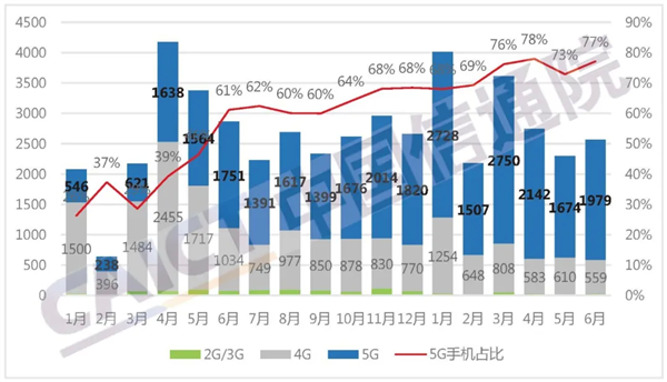 2021年1-6月,5G手機出貨量達到1.28億部,占同期手機出貨量的73.4%。