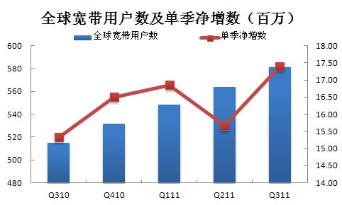 【訊石光通訊咨詢網(wǎng)】在經(jīng)歷了二季度的掙扎后,Q311全球?qū)拵в脩魧崿F(xiàn)了自2009年初以來最多的增長。截止Q311末,全球?qū)拵в脩魪腝211末的5.639億增長至5.813億,單季凈增數(shù)為1740萬,環(huán)比增長率為3.08%;相比Q310末,年增數(shù)為6640萬,年增幅為12.89%。