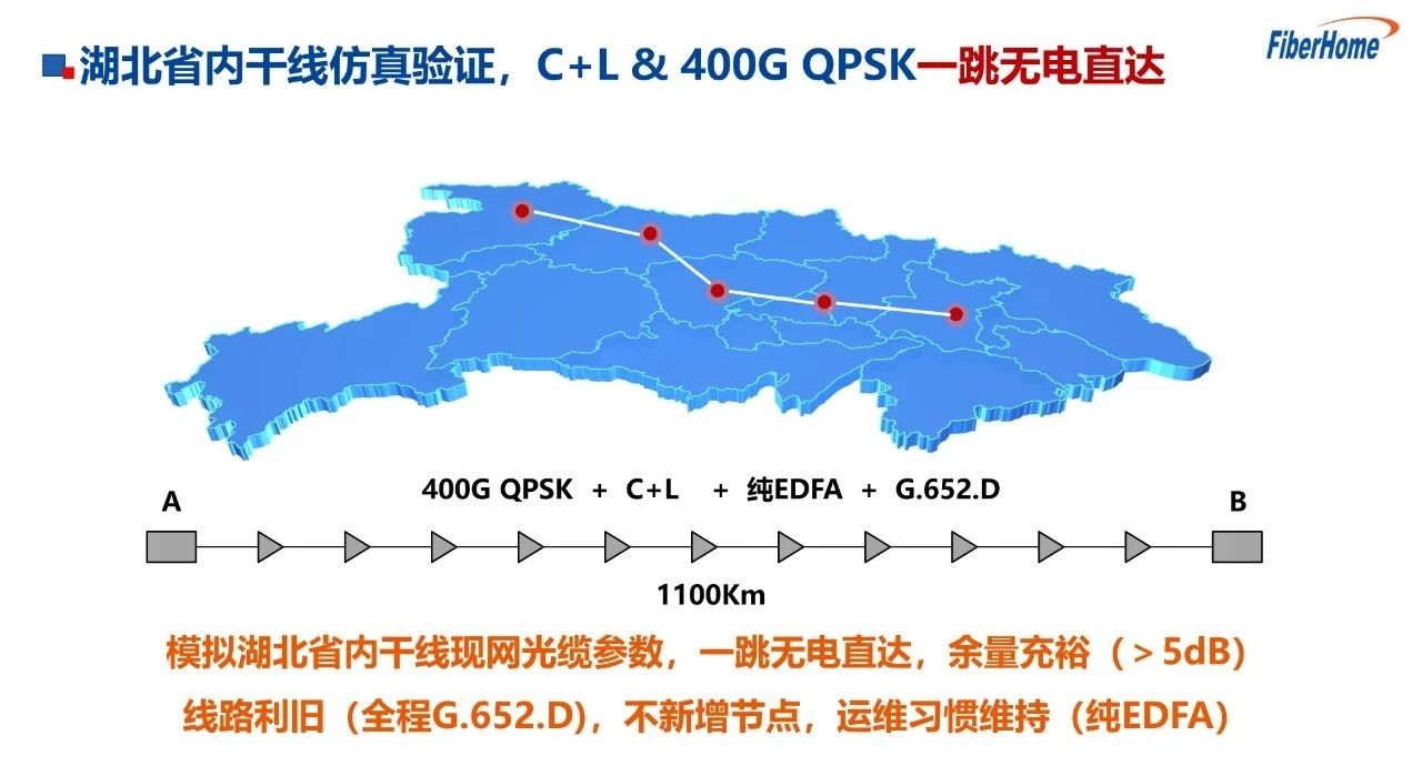 烽火通信基于湖北省內(nèi)干線網(wǎng)絡(luò)光纜數(shù)據(jù),采用C+L波段和400G QPSK技術(shù)進(jìn)行了現(xiàn)網(wǎng)長(zhǎng)跨段模擬測(cè)試。實(shí)驗(yàn)中,烽火通信實(shí)現(xiàn)了環(huán)回1100km的傳輸距離驗(yàn)證,系統(tǒng)的余量超過(guò)5dB,線路利舊(全程G.652.D),且不新增節(jié)點(diǎn),全程采用EDFA,系統(tǒng)性驗(yàn)證了在維持現(xiàn)有網(wǎng)絡(luò)結(jié)構(gòu)、維持現(xiàn)有運(yùn)維習(xí)慣、維持主流光纜類型的情況下,400G QPSK可以滿足干線網(wǎng)絡(luò)的傳輸性能要求。