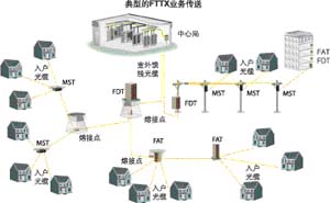 FTTP的光分配網(wǎng)的典型網(wǎng)元包括到光纖分配終端(FDT)的饋線光纜,分光器也位于FDT。分配光纜從FDT連到多光纖業(yè)務(wù)終端,入戶光纜也在這里連接進(jìn)來。然后入戶光纜從MST連到每個(gè)用戶大樓的光網(wǎng)絡(luò)終端(ONT)。