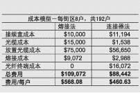 一個(gè)有192用戶的成本模型顯示:與傳統(tǒng)架構(gòu)相比,使用了MST和連接器的FTTP網(wǎng)絡(luò)可以使光纜成本降低85%(見表)。這主要是由于光纜費(fèi)用現(xiàn)在包括在了終端成本里。與此同時(shí),拉光纖的費(fèi)用降低了大約25%,熔接的費(fèi)用降低了大約70%。事實(shí)上,盡管MST增加了業(yè)務(wù)終端的成本,但是以每戶計(jì)的總成本明顯比網(wǎng)絡(luò)配線低大約19%。