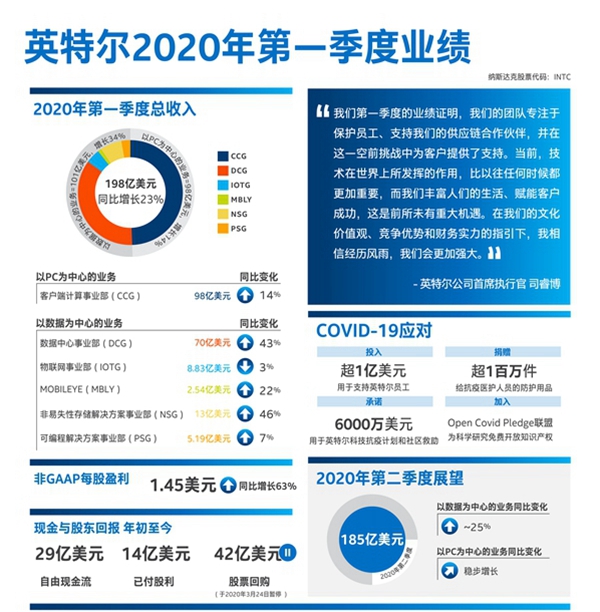 “第一季度業(yè)績證明,我們的團(tuán)隊專注于保護(hù)員工,支持我們的供應(yīng)鏈合作伙伴,并在這一前所未有的挑戰(zhàn)中為我們的客戶提供服務(wù)。”英特爾首席執(zhí)行官鮑勃-斯萬(Bob Swan)在財報中說道。“技術(shù)在當(dāng)今世界上發(fā)揮的作用現(xiàn)在比以往任何時候都更加重要,我們豐富生活和使客戶獲得成功的機(jī)會從未像現(xiàn)在這樣重要過。在我們的文化價值、競爭優(yōu)勢和財務(wù)實力的指引下,我有信心我們將從當(dāng)前形勢下脫穎而出,成為一家更強(qiáng)大的公司?!?